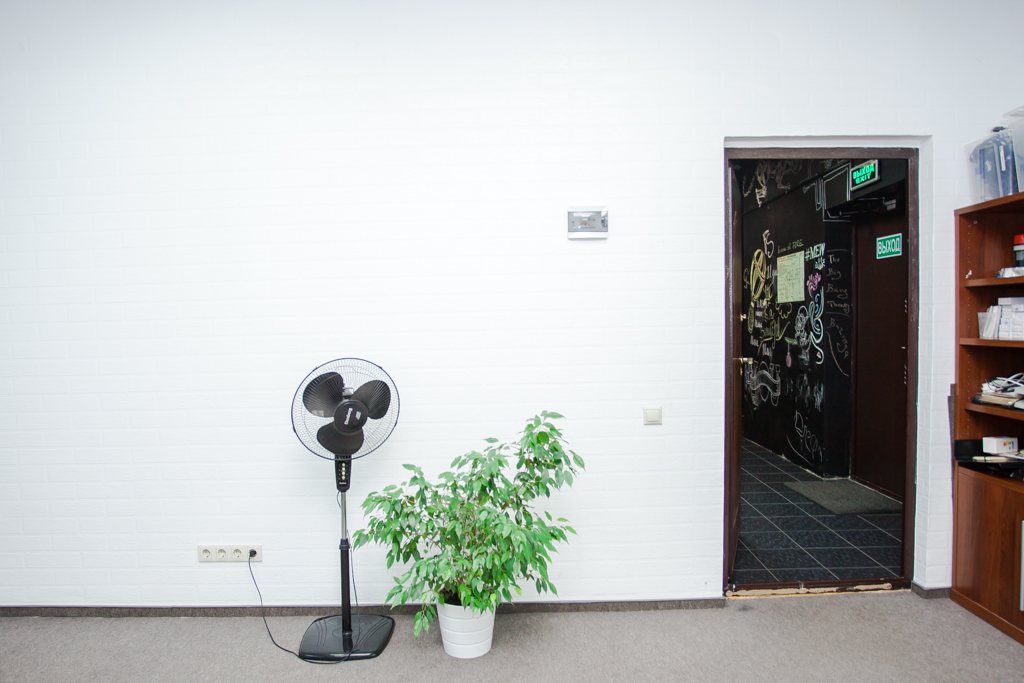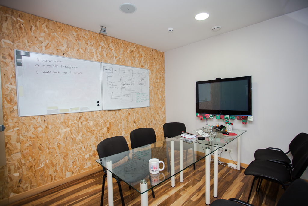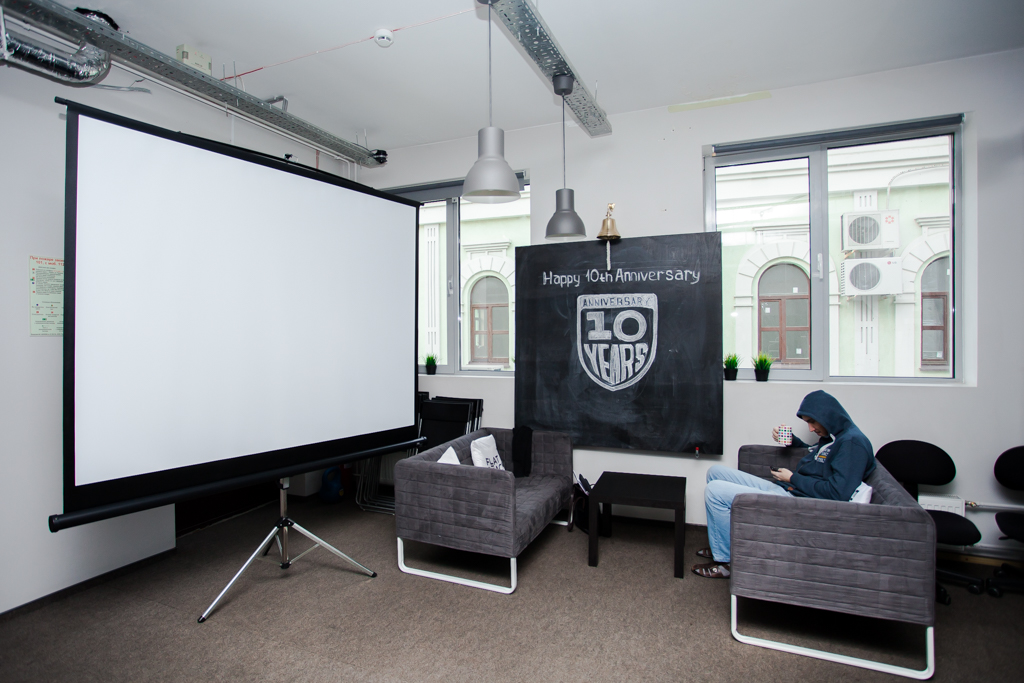 На сегодняшний день офис поделен на зоны: у нас есть помещение для дизайнеров и мобильных разработчиков, группа столов административного персонала, переговорные комнаты, каждая из которых имеет свой оригинальный стиль, а остальное пространство отдано проектным группам. В нашей кухне, кроме современной техники и вкуснейшего запаха кофе, всегда есть место и для отдыха — во время обеда мы можем посмотреть фильм или поиграть на приставках. В демо-зоне можно отдохнуть на качелях и мягких пуфиках. В отделке активно используем меловые поверхности, чтобы ребята могли больше рисовать и общаться в offline.