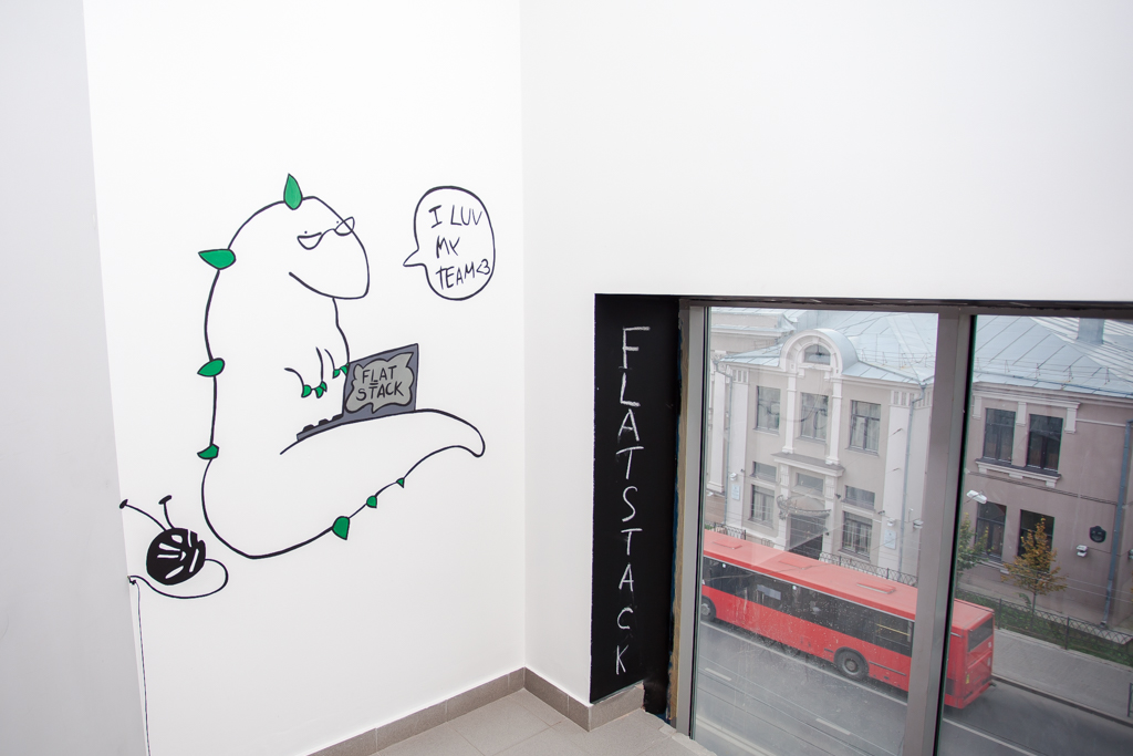 Офис компании находится в одном из недавно отреставрированных зданий на улице Пушкина. Попасть на этаж компании не так просто — нужно иметь специальный пропуск, который позволит подняться на лифте на нужную высоту. Офис Flatstack — это современное деловое пространство, в котором царит дружественная атмосфера, и это чувствуетcя сразу после того, как открываются двери офиса. Компания специализируется на разработке сайтов, мобильных и интернет-приложений, а также консультировании в IT-сфере.