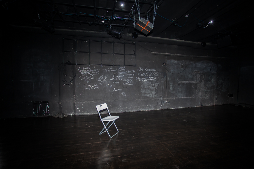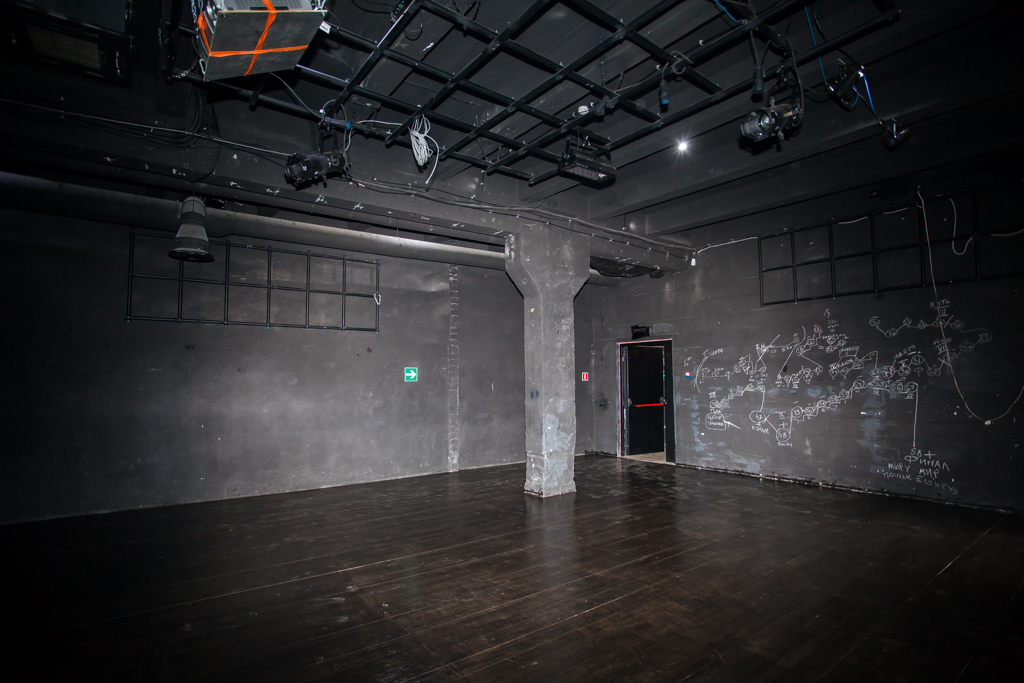 Дальше идет основной зал, он самый большой из трех (площадь 90 кв.м.). В нем происходят все события: лектории, спектакли, кинопоказы, читки, форумы, мастер-классы. Пространство абсолютно мобильно: сцена трансформируется, то превращаясь в кинотеатр, то сливаясь со зрителями. Иногда стулья просто стоят рядами, иногда их выстраивают амфитеатром. Для этого в лаборатории есть специальные станки для зрительного зала — металлические конструкции с дощатыми перекрытиями, которые позволяют создавать любую сцену.