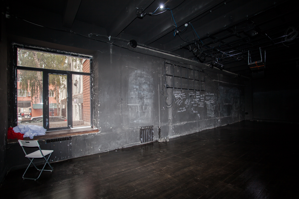 Если пройти основной зал насквозь, упрешься в большую железную дверь. За ней спрятано третье помещение. Оно одновременно служит и гримеркой для артистов, и репетиционной, и складом для декораций, и местом хранения звукового и кинооборудования, и комнатой отдыха.