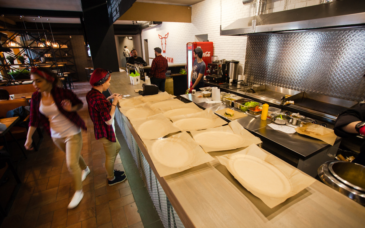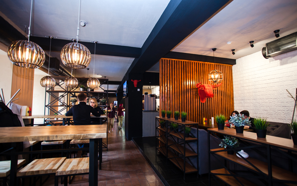 Внешне персонал соответствует потенциальной аудитории: девушки в клетчатых рубашках, с разноцветными волосами и зачастую татуированные, а повара — молодые парни. «The Тёлки» — это заведение быстрого питания, где интерьер максимально соответствует задаче «нужно быстро перекусить». А о названии бургерной напоминают только огромный логотип на барной стойке и хаотично развешанные деревянные головы коров, выкрашенные в красный цвет. Не хватает только самого Сергея Минаева, вальяжно разгуливающего по узким коридорам, но его визит в Казань запланирован только на апрель.
