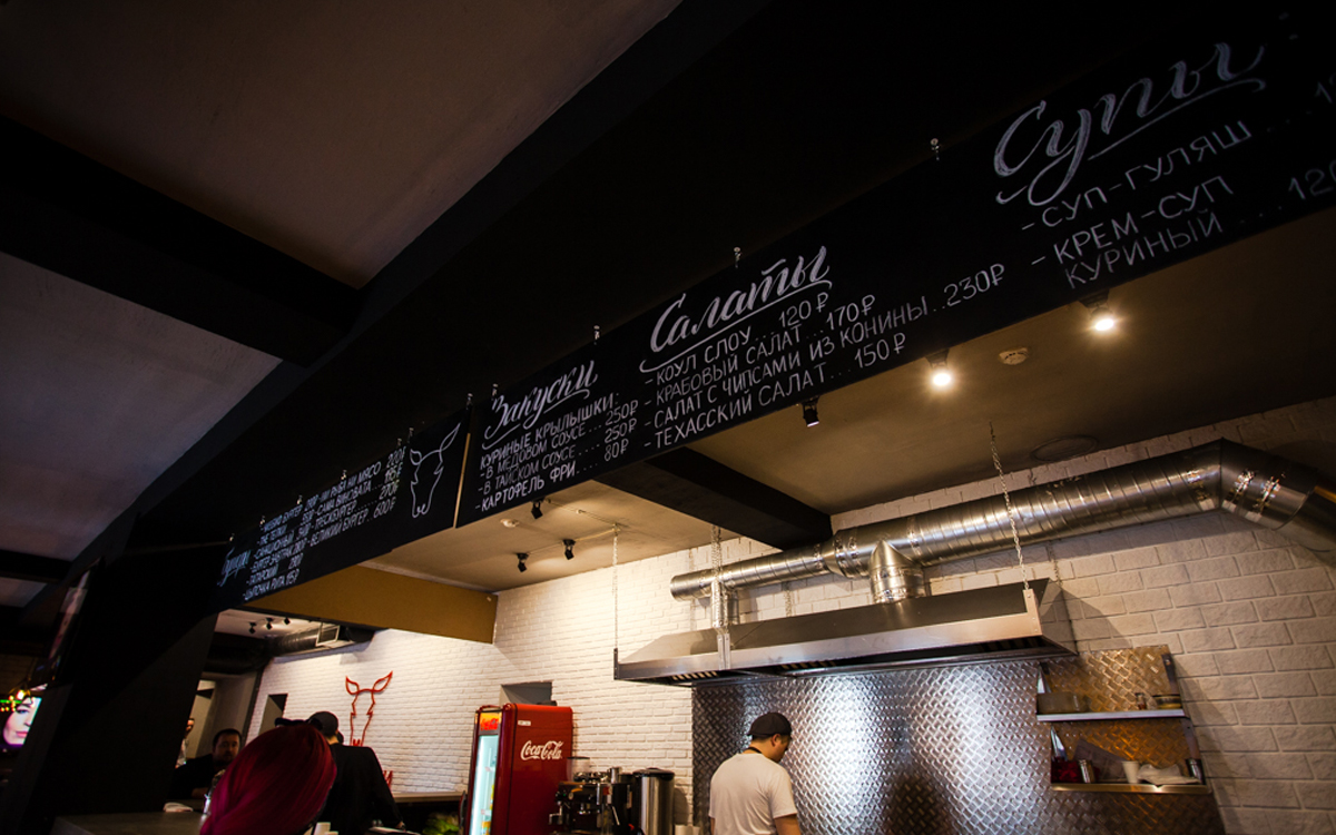 Безоговорочную победу по популярности среди блюд одерживает фирменный бургер «The Тёлки», состав которого не оставляет сомнений в его вкусовых качествах: мраморная котлета, овощи, медово-горчичный и барбекю соусы, жюльен и грудинка из конины. Цена для такого блюда вполне демократичная — 350 рублей. Есть два бургера халяль. Первый называется «Цыпочка Рита» и состоит из куриного филе в острой панировке, соуса лечо и тар-тар, чеддера и овощей за 195 рублей. Второй называется «Трескбургер», в основе которого, как не сложно догадаться, треска. Рыбный бургер стоит 270 рублей. Не обошли стороной и вегетарианцев, для которых в меню есть одна позиция с необычным названием «Сама виновата» за 195 рублей, в составе которой шампиньоны, овощи и соус песто. Самым большим и дорогим бургером стал «Великий бургер», который весит почти 500 грамм и состоит не только из двойной мраморной котлеты, но и наполнен всеми возможными топпингами всего за 600 рублей. Закуски в виде куриных крылышек, салаты и супы включены в меню, скорее, для того, чтобы его разнообразить, поэтому даже не стоят внимания.