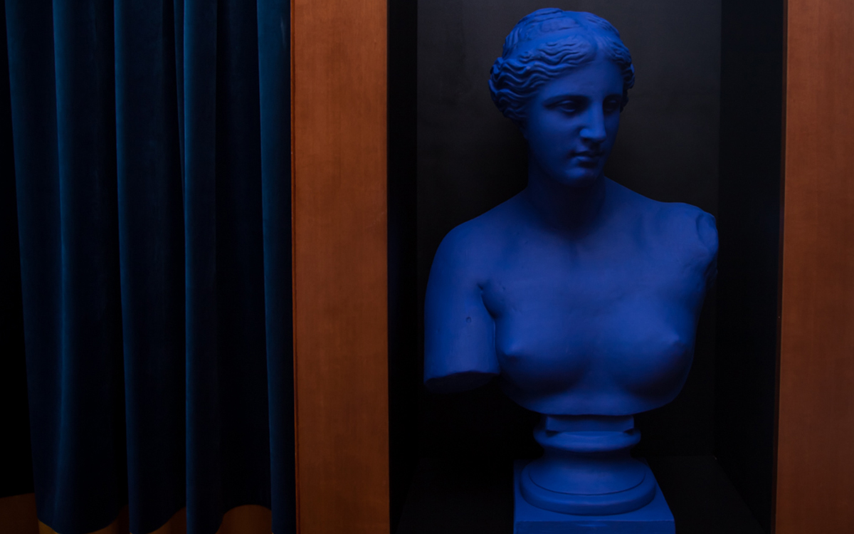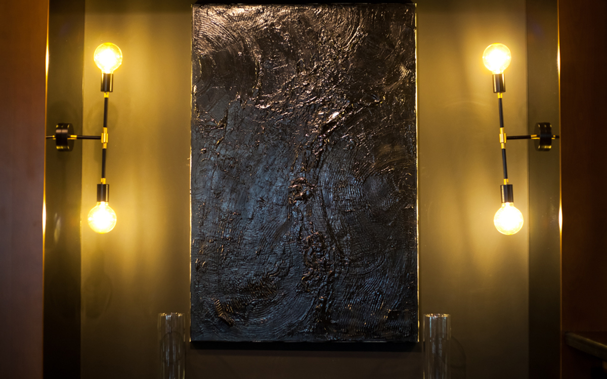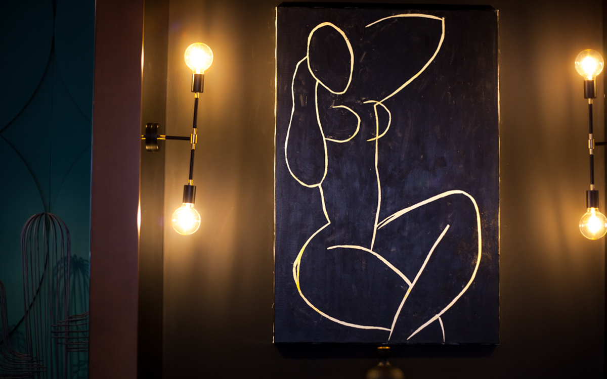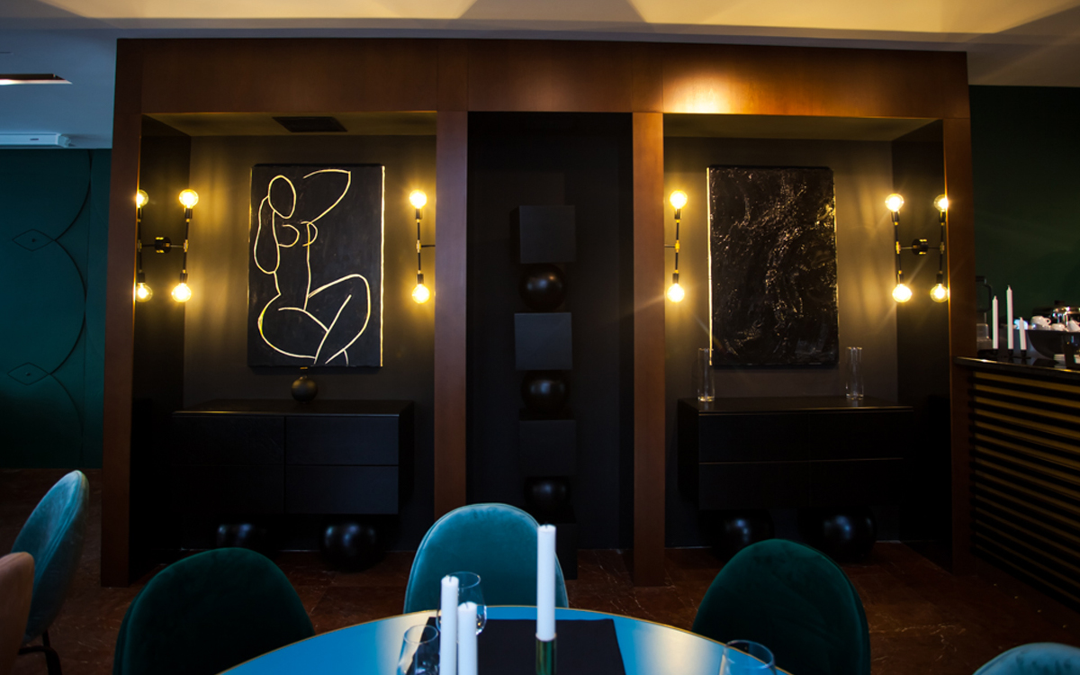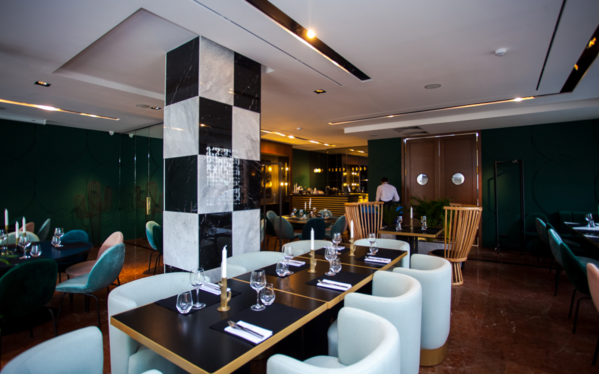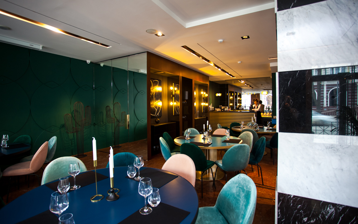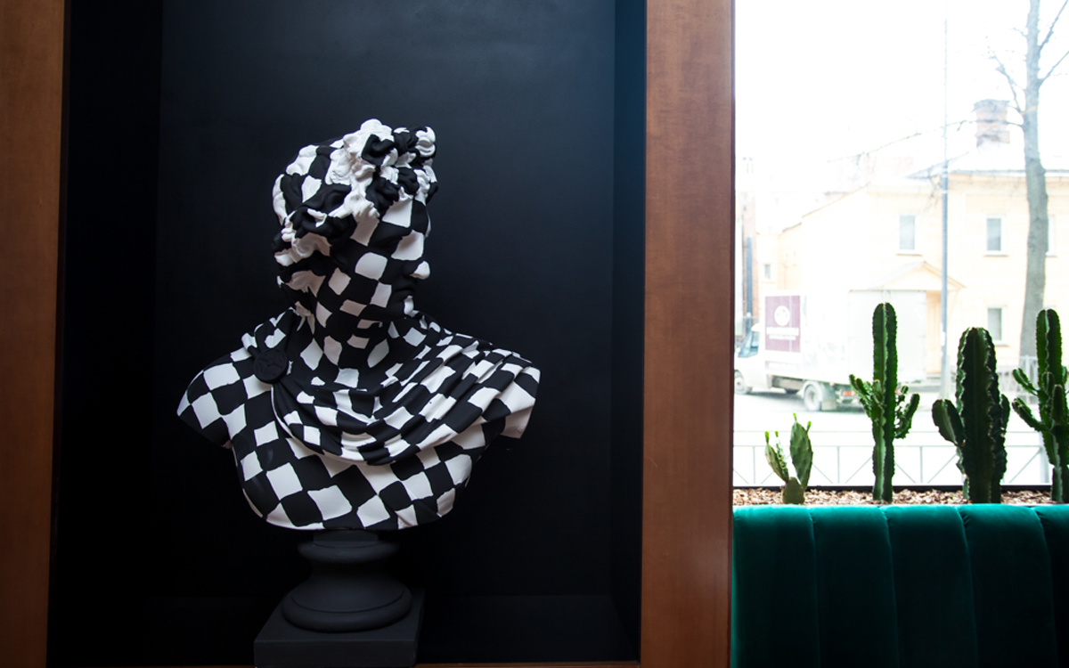 Учредители Virid Yard — Шагиахметова Ландыш и Пимурзина Лейсан нашли место для ресторана практически сразу. Это помещение на первом этаже в 130 квадратных метров, расположенное на улице Волкова. Когда-то здесь был магазин мужских костюмов, но теперь это в прошлом, сейчас здесь воссоздан дизайн в стиле Америки 60-х−70-х годов, но в более роскошной интерпретации. Как рассказала нам Ландыш Махмутовна, одна из основателей ресторана, основной задачей было создание интерьера, не похожего ни на одно заведение в городе. Сегодня идет поголовное обращение к стилю лофт, из-за чего все заведения похожи друг на друга. Но это не коснулось Virid Yard, в его интерьере есть три основных цвета: зеленый, синий и коричневый, которые гармонично сочетаются друг с другом. Кроме этого, в зале заведения расставлены яркие акценты в виде арт-объектов. Например, квадратная колонна, покрытая мраморными черно-белыми пластинами, в нишах около барной стойки висят репродукции картин известных художников и самое главное — два бюста у входа. Один из них раскрашен в черно-белый цвет, а Венера Милосская — в синий. В помещении много солнечного света за счет больших панорамных окон и зелени в горшках, а также кактусов — они являются основной фишкой заведения. Их можно найти везде: живые калифорнийские — сидят на подоконниках, медные подсвечники в форме колючих растений стоят на столах, а около большого зеркала, за которым находится уборная, размещен еще один арт-объект — черный кактус из металлических прутьев.