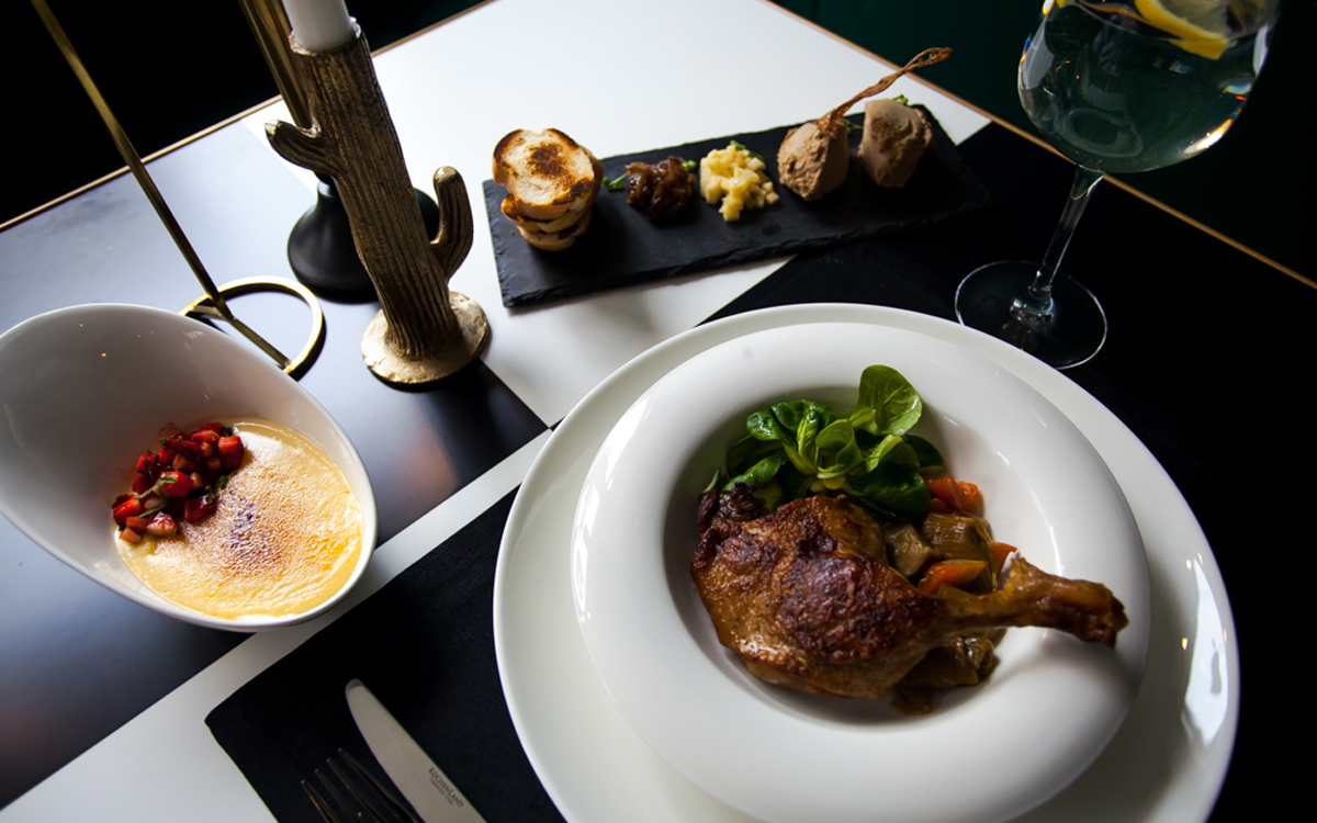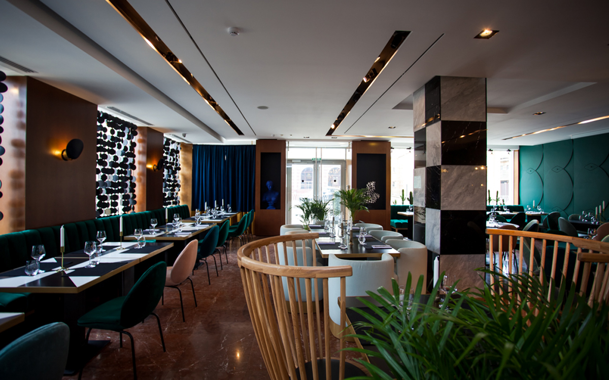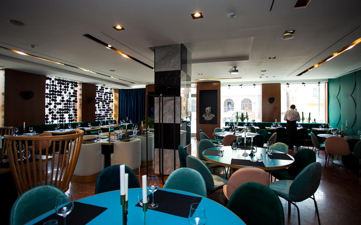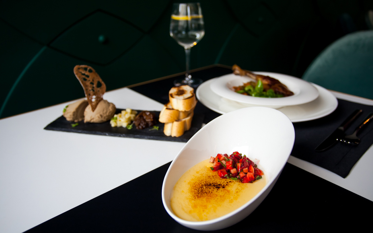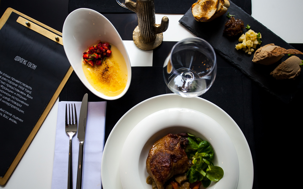 Virid Yard — это ресторан с европейской и авторской кухней, в котором за основу взяты традиционные итальянские и французские блюда. В основном меню сделали акцент на морепродукты: здесь можно найти блюда с дальневосточными гребешками, щупальцами осьминога, вонголе (морские моллюски, — прим. Enter), тигровыми креветками, лососем и рыбой сибас. В скором времени появится отдельное меню для завтраков и банкетов. Что касается обедов, они здесь тоже предполагаются, но в формате «блюдо дня от шефа» — это позиции из основного меню, но по фиксированной цене (как правило, дешевле) и с быстрой подачей. Шеф-повар ежедневно будет готовить блюда по трем позициям: закуски, основные блюда и десерты, также на свое усмотрение будет вводить что-то новое, например, в будущем планируется дополнение меню блюдами горячего копчения и расширение позиции специалитетов.