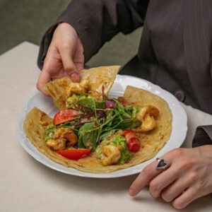 Популярные лепешки в кафе готовят с двумя начинками. Первая — креветки с мятым авокадо, черри, миксом салатов и кунжутно-ореховым соусом (890₽). Вторая — пастрами из индейки со страчателлой, мятным песто и фисташкой (670₽).
