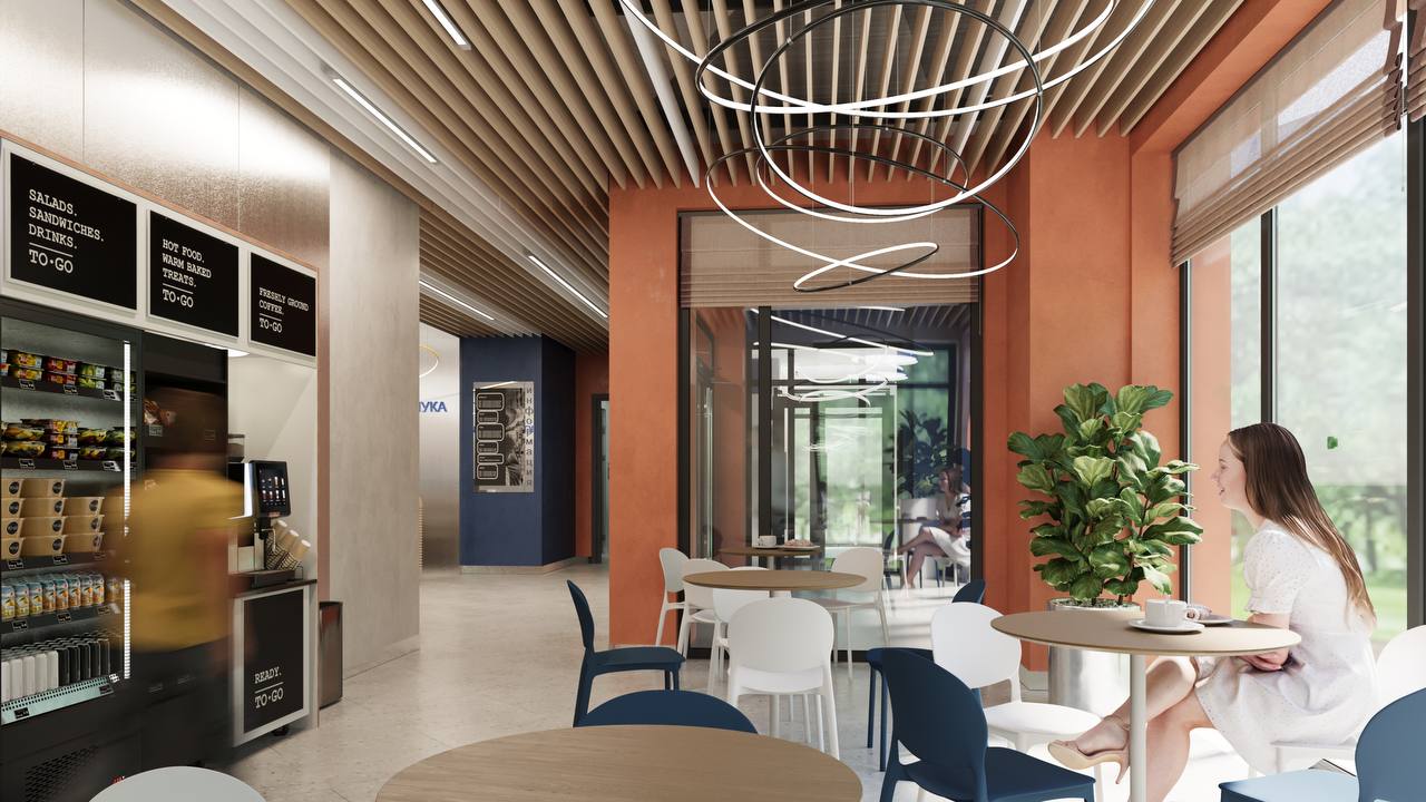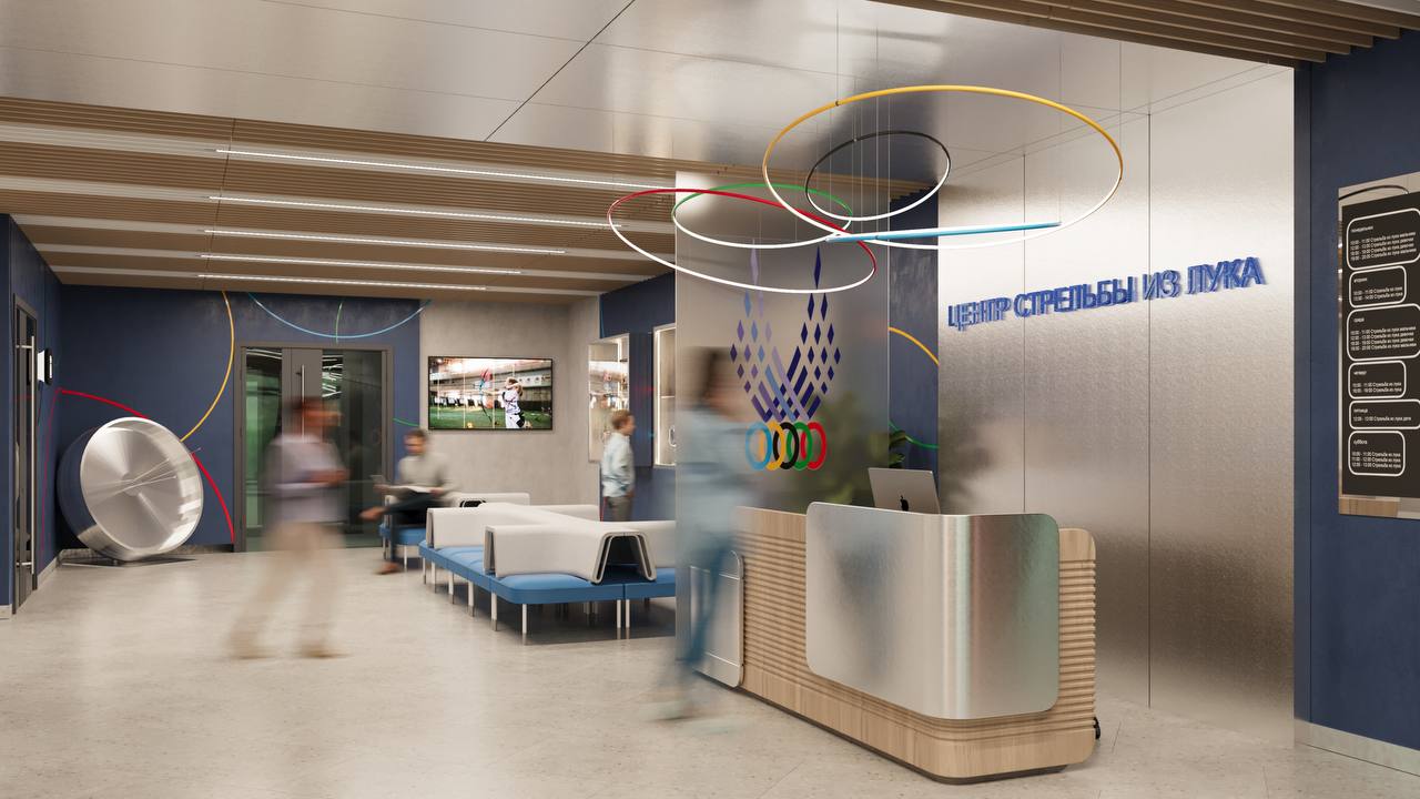 Интерьеры здания выполнят в минималистичном стиле с деликатными цветовыми акцентами — они отсылают к цветам олимпийских колец. В центральном холле появится зона ожидания с местами для регалий спортсменов, а также стилизованная стальная мишень. Этот арт-объект представили еще в сентябре, во время закладки камня. В мишени находятся три стрелы — Рустама Минниханова, Игоря Краснова и Дарьи Орешниковой.