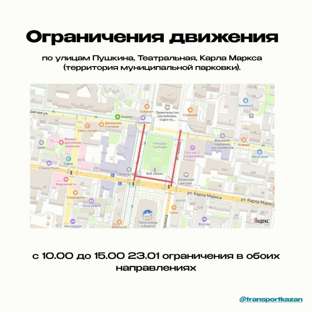 23 января в Казани временно ограничат движение транспорта на участках улиц Пушкина, Театральной и Карла Маркса. Об этом предупреждает мэрия.
