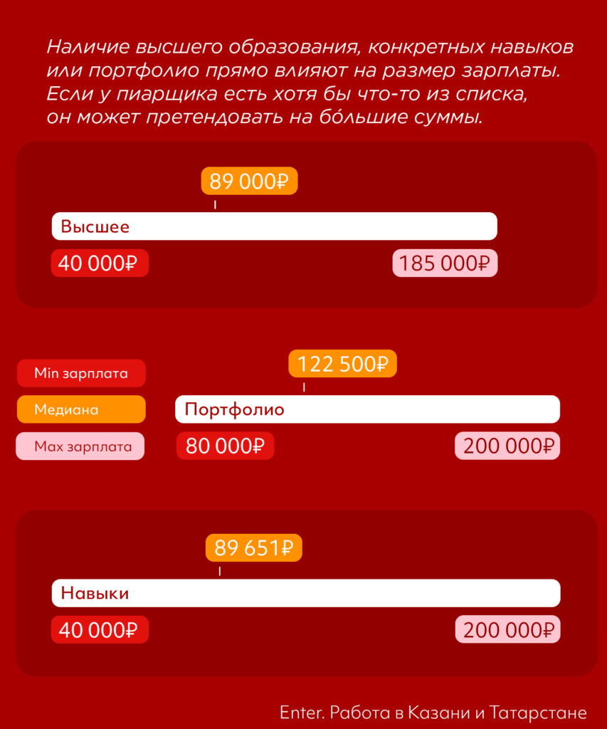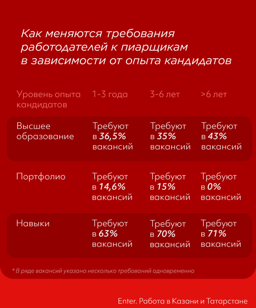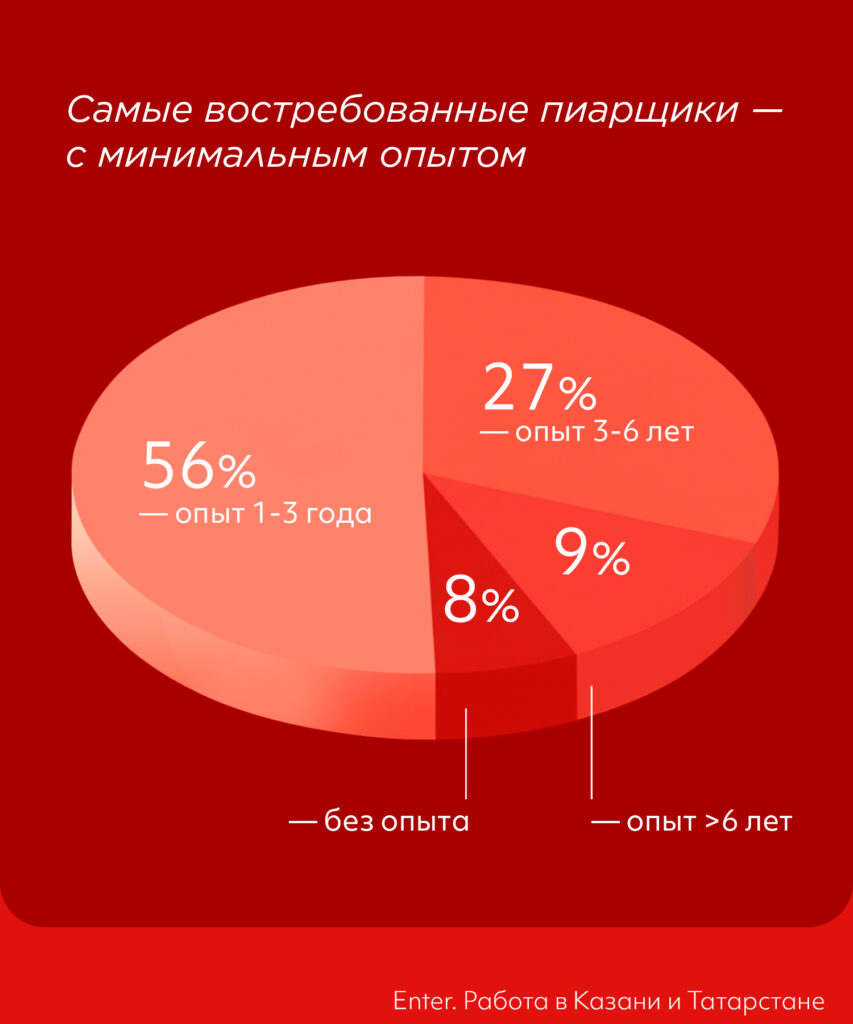 Возможно, это соотношение связано с тем, что работодатели не готовы учить пиарщиков с нуля и предпочитают постепенно развивать специалистов внутри. При этом чем выше требование к опыту кандидата, тем больше ему готовы платить.