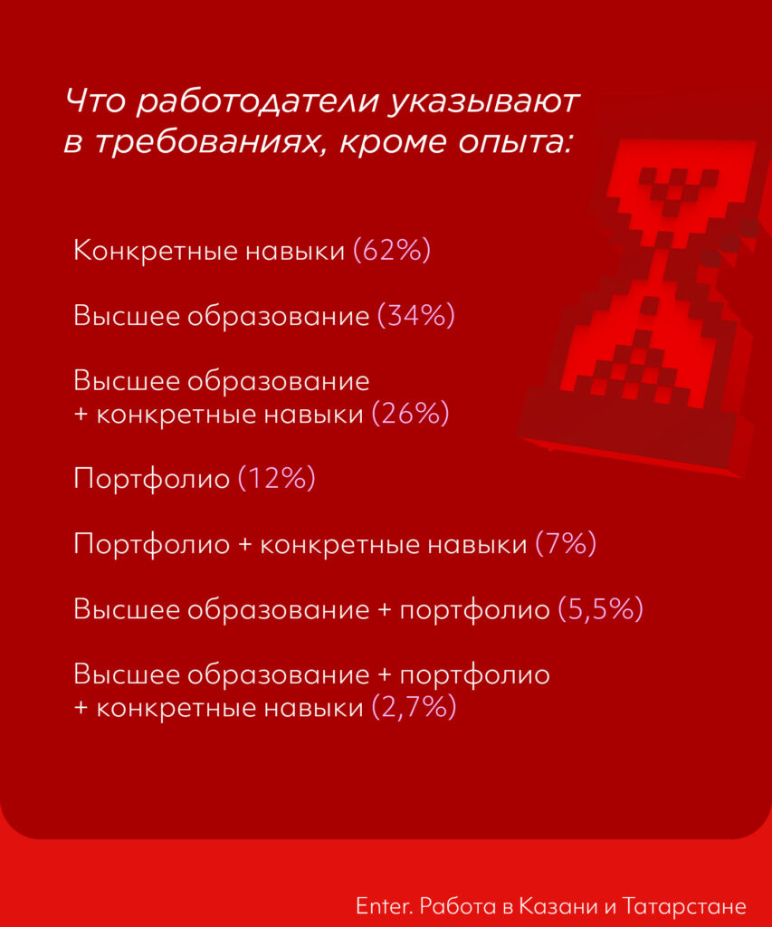 Список требований меняется в зависимости от того, насколько опытного сотрудника готовы взять в команду. Чаще всего работодателям важны навыки кандидата. Интересно, что с годами опыта кандидатов у работодателя растет интерес к их образованию. А вот портфолио у самых опытных в исследованных нами вакансиях вообще не спрашивают.
