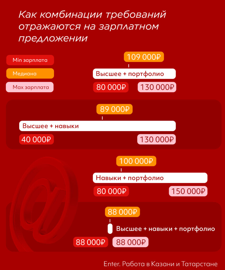 Наличие высшего образования, конкретных навыков и портфолио в списке требований повышает уровень предлагаемых зарплат. Зафиксированный минимум — 40 000 рублей, а максимум — 200 000 рублей.