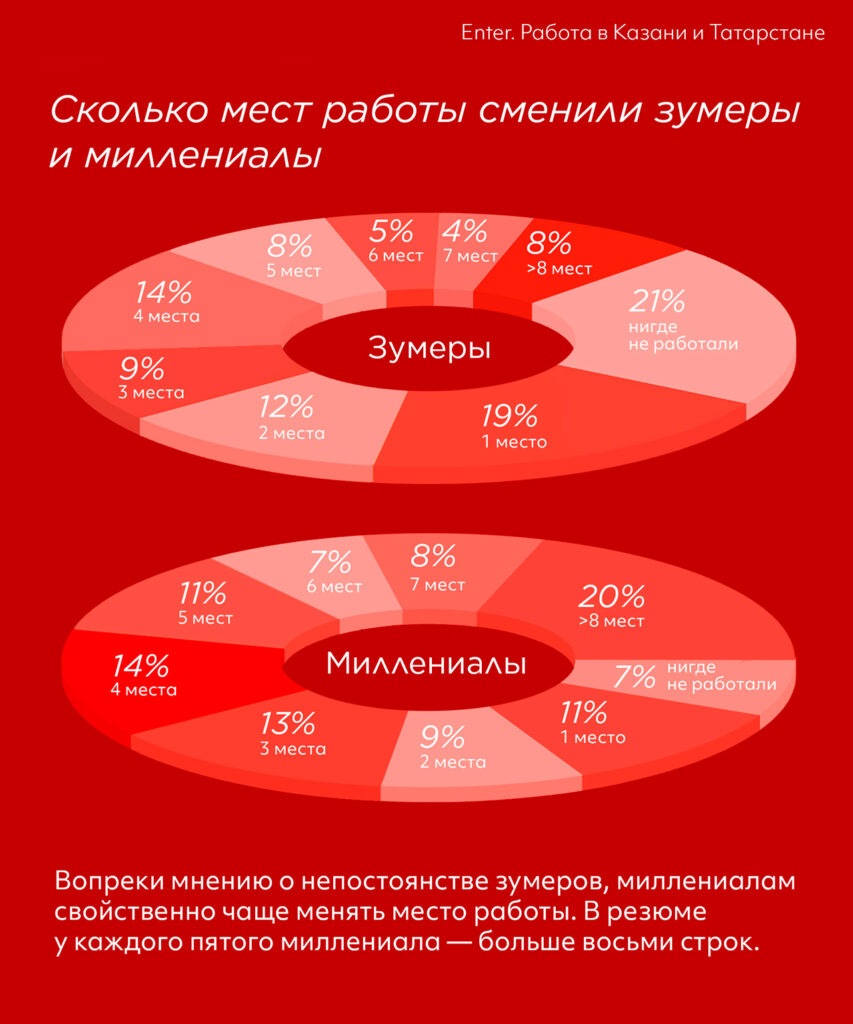 Миллениалы меняют место работы в 2,5 раза активнее зумеров, причем каждый пятый поменял минимум восемь работодателей. Если для молодых перемены — естественный процесс поиска, то для опытных — сигнал либо о профессиональной переквалификации, либо о кризисе удержания талантов в отрасли.