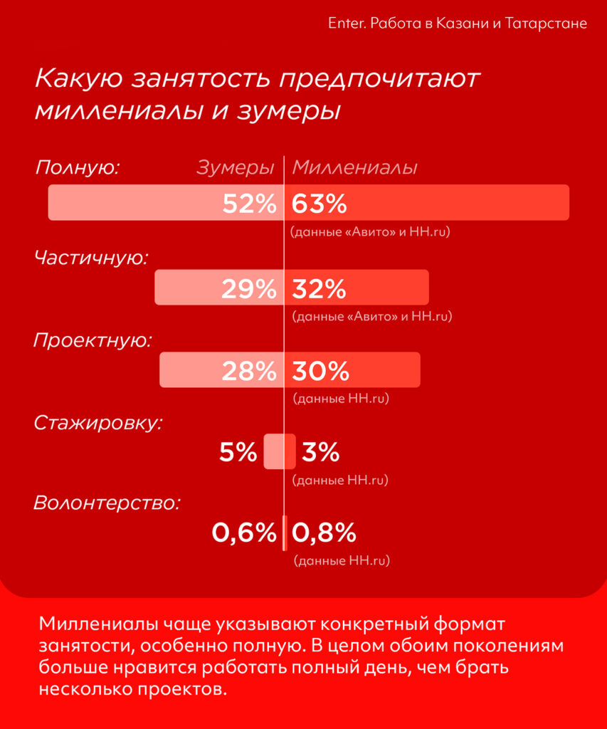 И зумеры, и миллениалы ищут постоянную работу. По сравнению с зумерами, миллениалы на 11% более консервативны в выборе традиционного трудоустройства. Это может отражать как семейные обязательства, так и меньшую готовность к экспериментам.