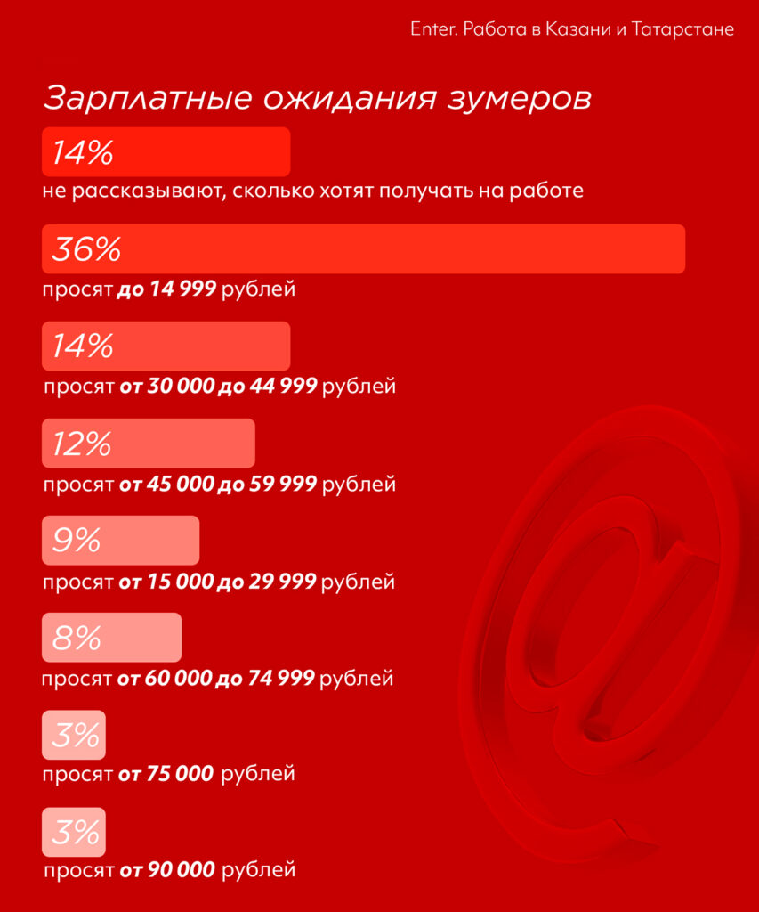 Хотя на зарплату до 15 000 рублей претендуют 17% миллениалов и 36% зумеров, вакансий с такой оплатой всего 2% от общего числа. Судя по средней предлагаемой зарплате от 45 000 до 75 000 рублей, молодые специалисты склонны себя недооценивать. Глобально на рынке есть спрос на квалифицированные кадры даже для позиций, которые зумеры считают начальными. Это может отражать либо необходимость компетенций выше стартовых, либо дефицит предложения молодых кадров, заставляющий работодателей повышать оклады.