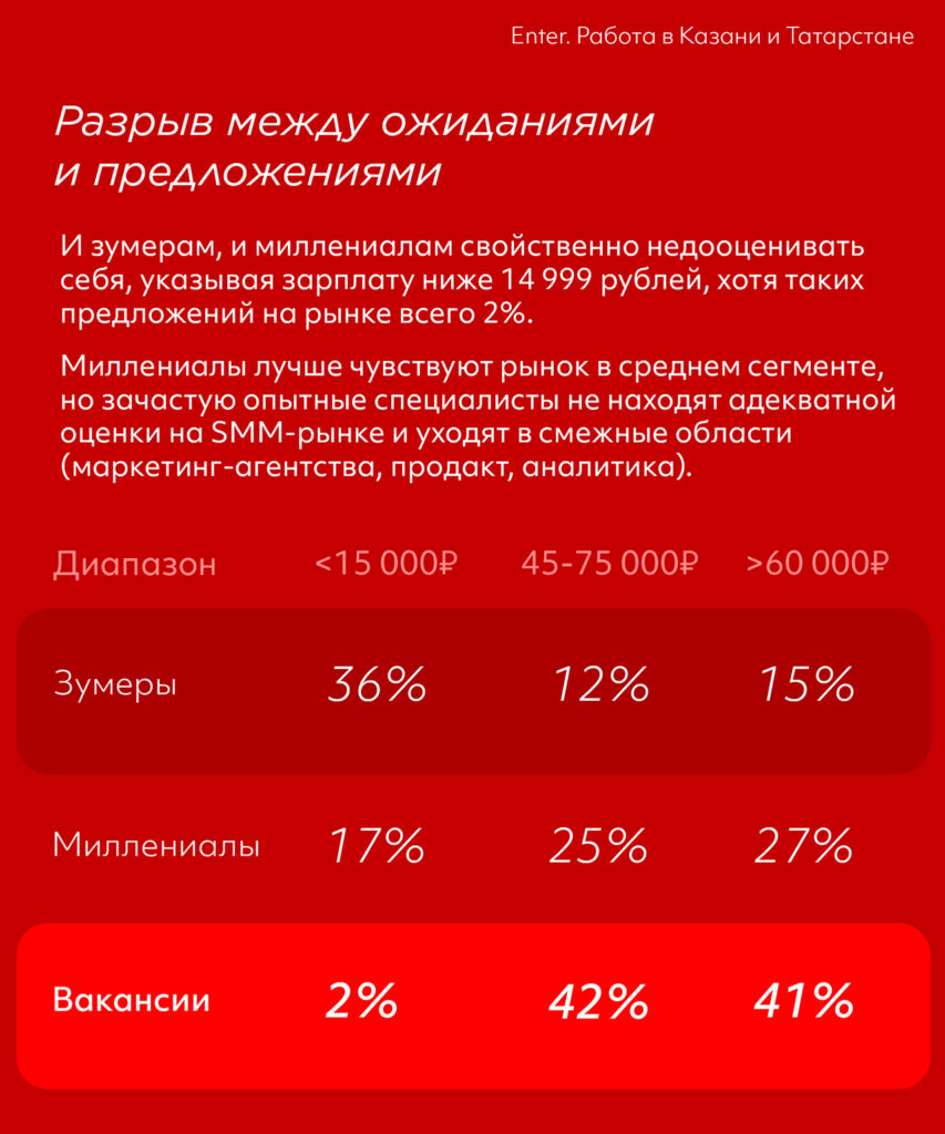 4% миллениалов, претендующих на 90 000 — 105 000 рублей, сталкиваются с критическим дефицитом предложений. Такая разница может объяснить высокую текучесть в этом поколении: опытные специалисты не находят адекватной оценки на SMM-рынке и уходят в смежные области: маркетинг-агентства, продакт и аналитику.