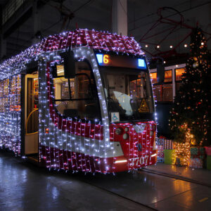 Пассажиры смогут встретиться с Дедом Морозом и Снегурочкой, сделать фотографии и поучаствовать в караоке-баттле. Новогодний трамвай будет останавливаться на всех станциях по ходу маршрута.